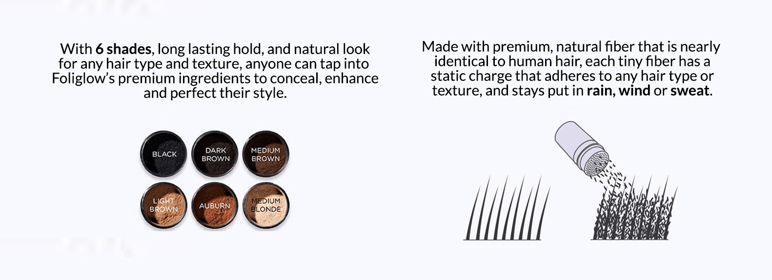 FOLIGLOW Building Fibers stay firmly in place even in wind, rain and perspiration. For even longer-lasting results and added shine, use FOLIGLOW Fiber hold spray.