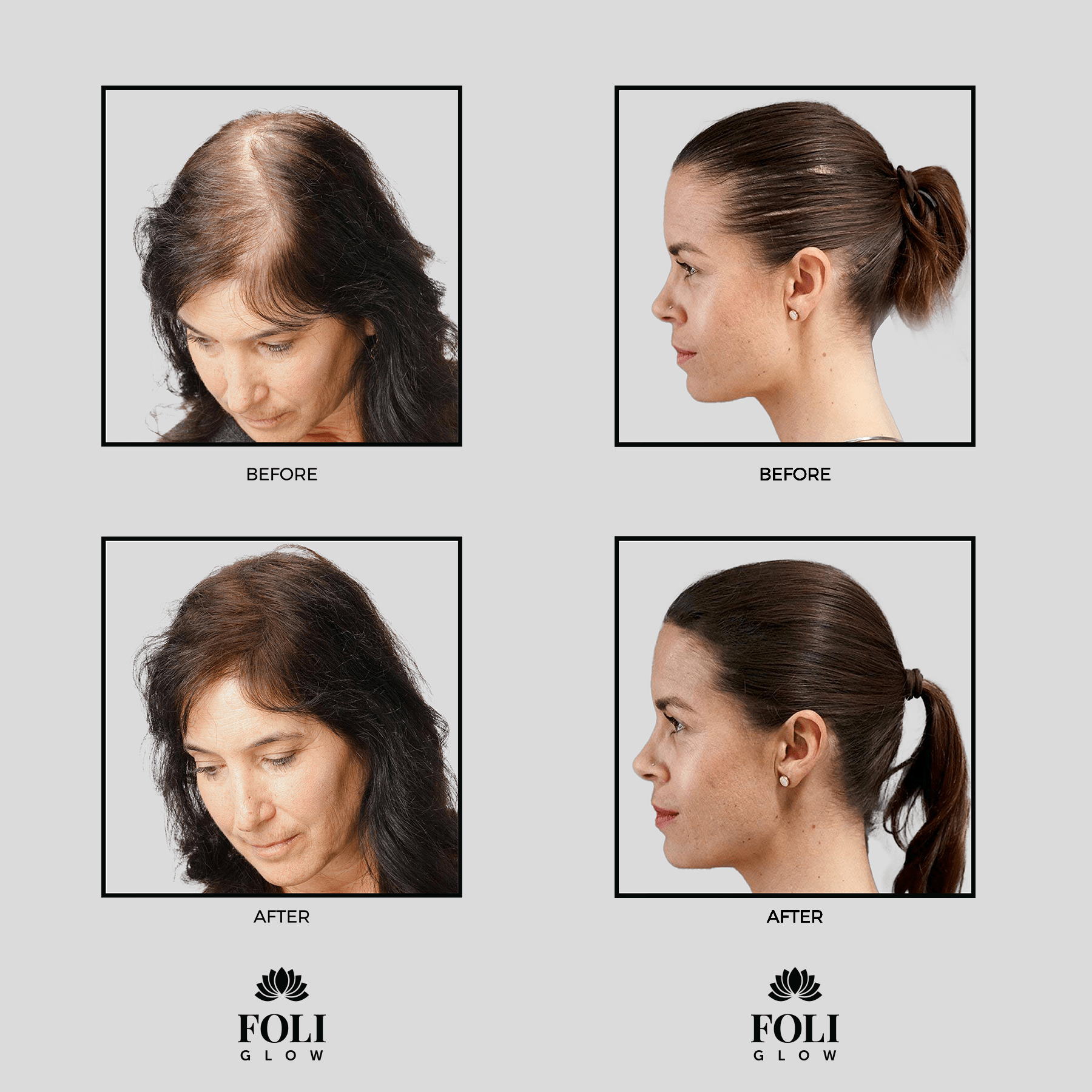 Foliglow employs natural iron oxide-based colorants for a seamless match with your existing hair color. Our advanced technology ensures undetectable, natural-looking blending of hair fibers.